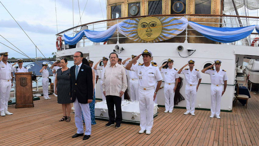 Para finalizar la jornada, se realizó a bordo la ceremonia de condecoración a la Bandera de Guerra de la fragata ARA “Libertad”. La misma fue presidida por el Embajador Argentino, acompañado por la Embajadora de Costa Rica ante la República Argentina, Ginnette Campos Rojas.